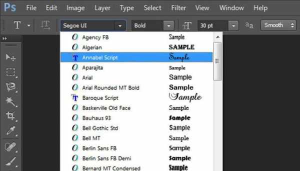 В окне предпросмотра Photoshop показывает не только имя каждого шрифта, но и отображает предварительный просмотр образца внешнего вида (для образца применяется слово «Sample», располагающееся справа от названия шрифта):