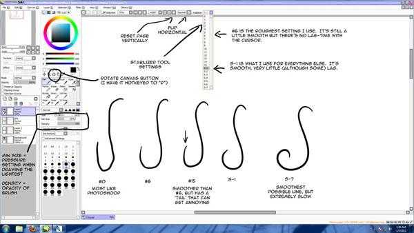 2) А вот об этом я вспомнила относительно недавно — это сглаживание штриха. Чтобы понять, как оно действует поэксперементируйте. Если вы рисуете мышью, или у вас не очень хороший планшет (как у меня:-D (был на момент наисания статьи — прим. авт.) ) сглаживание штриха вам необходимо, если решите рисовать контуры от руки.
