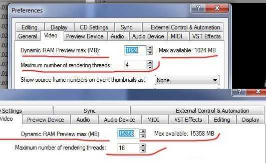 6. Зайдите в настройки вегаса (Options -> Preference-> Video) и выбирете «использовать 4-х потока» или больше если позволяет система. (use 4 threads). В 64-х битном вегасе возможности шире. Но если у вас после этого происходят рандомные вылеты и краши программы, верните использование до 2 threads. Чем меньше используется поток тем программа стабильней,но использование бОльшего числа поток значительно ускоряет процесс работы в вегасе, в целом (но это действие конечно же выполнимо для многоядерных и много поточных процессоров). тоже самое относится и к динмаческой памяти. Максимальное число в 32-х битном вегасе 1 Gb, в 64-х битном максимальное значение ограничивается физическими возможностями, иными словами сколько установлено — столько и потолок. См. мой пример внизу.