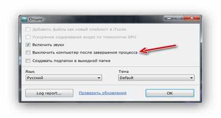 Пару моментов — если видео большого размера (длительное), то процесс может затянуться. В «Опции…» есть настройка самостоятельного выключения компьютера по окончании процедуры…