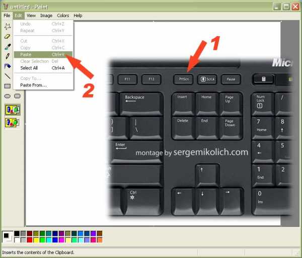 Нам нужно изображение, хранящееся в буфере обмена, превратить в графический файл для дальнейшей работы (1). Идем в меню Программы, переходим в подменю Стандартные, выбираем редактор Paint. Теперь вставим из памяти наш снимок дисплея, меню Редактирование, команда Вставить (2).