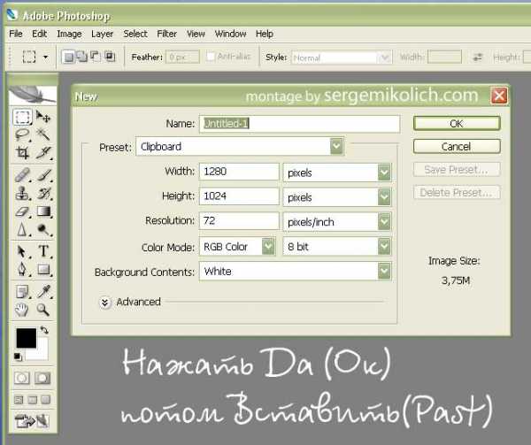 - После графического редактирования документа, запустите файл в программе Photoshop. Воспользуйтесь функцией File – New. Сохраните кадр из буфера обмена и перенесите кнопкой Ctrl+V.