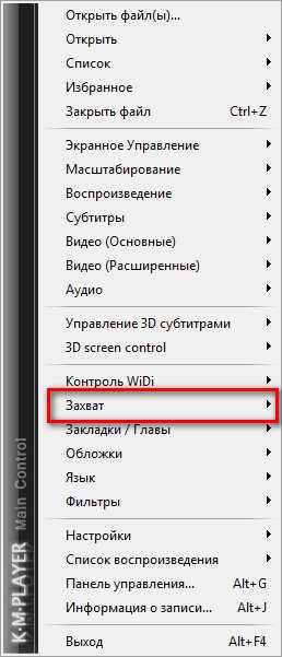 проигрывателя правой кнопкой мыши. Таким образом появится контекстное меню программы, в котором выбираем «Захват».
