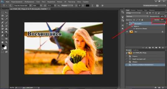 Итак, вы добавили картинку к проекту с текстом. Она должна была появиться на новом слое. Установите для этого слоя непрозрачность порядка 60 — 70%. Это нужно для того, чтобы видеть, где расположен ваш текст.