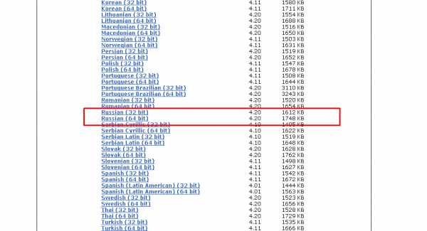 Попав на нужный сайт, следует пролистать страницу вниз и выбрать необходимый язык программы. В нашем случае выбираем русский. Также, при выборе файла обратите внимание на разрядность системы Windows XP и подберите нужную.
