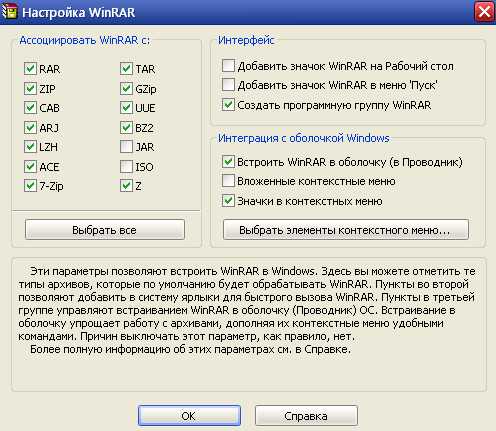 В 1 рамке “Ассоциировать WinRAR с” можно указать программе, с какими расширениями ей ассоциироваться (т.е. WinRAR будет открывать файлы с расширениями, которые указаны галочками).