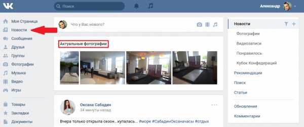 Актуальные фотографии в ВК — это блок фотографий Ваших друзей и их друзей. Найти блок можно в разделе «Новости».