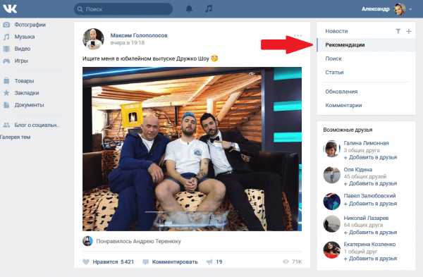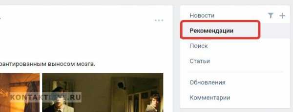 Тогда в верхнем правом углу выбираем вкладку «Рекомендации» и листаем ленту новостей: