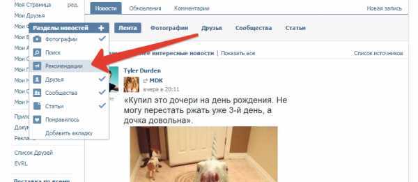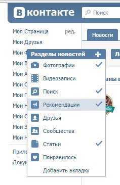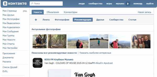 Можно изменять настройки отображения хоть каждый день. Помимо общих новостей на ресурсе удобно просматривать контент по разделам. В подменю справа, располагаются кнопки для отдельного показа фото, видеороликов, списков, комментов. Там же, вы найдете поле «Рекомендации».