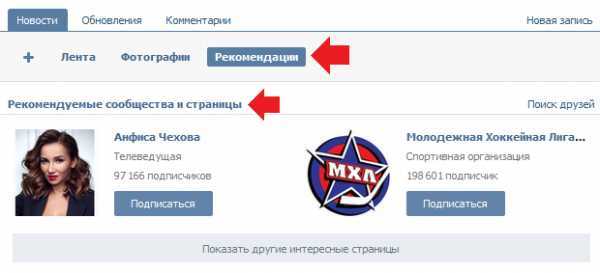 Появится раздел «Рекомендации». Зайдите в него. В верхней части окна вы увидите подраздел «Рекомендуемые сообщества и страницы».