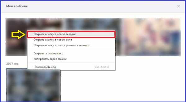 Для того чтобы появились кнопки «Добавить, редактировать альбомы», нажмите правой кнопкой мыши на любое фото в верхнем ряду, и выберите из выпадающего списка — пункт «Открыть в новой вкладке».