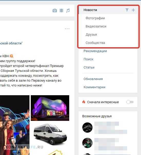 - в левом столбике с разделами вы можете выбрать контент, который будет отображаться в ленте: