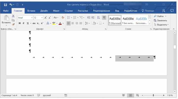 6. На месте установленных вами пробелов (знаков табуляции) появится горизонтальная линия — строка для подписи.