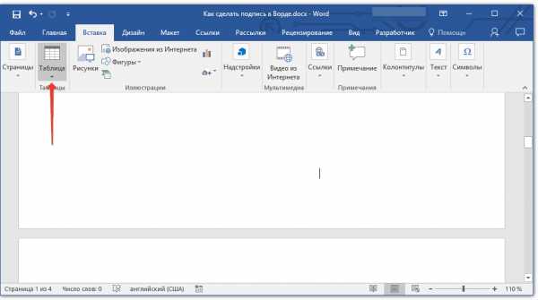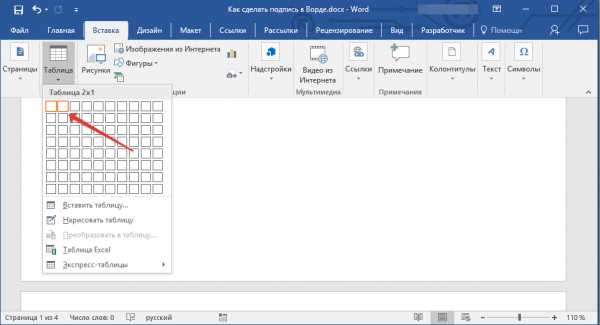 Рассмотрим, как можно в программе ворд сделать линию для подписи без текста. Открываем новый лист, в котором будем делать подпись. Сначала его разделим на две части, при помощи таблицы. Для этого на верхней панели настроек, заходим в закладку «Вставка» и нажимаем на иконку «таблица» и выбираем таблице с параметрами 2х1.