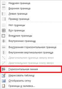 Во вкладке меню «Главная» выберите иконку «Границы». Если вам нужна именно черта для подписи, то кликните по строчке «Горизонтальная линия».