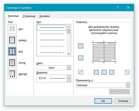 Щелкните таблицу правой кнопкой мыши, выберите пункт Границы и заливка и перейдите на вкладку Граница.