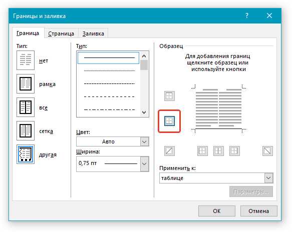 13. В разделе “Образец” кликните по маркеру, на котором отображено нижнее поле, чтобы сделать видимой только нижнюю границу таблицы — это и будет строка для подписи.