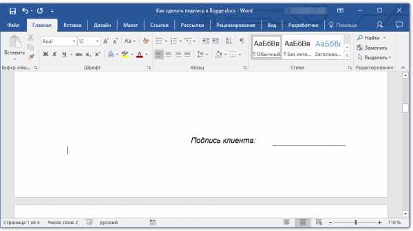 Добавление строки для подписи — Word