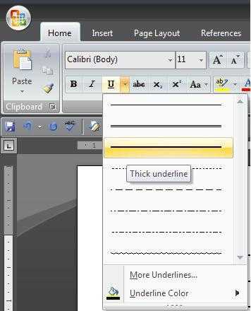 - Если стандартный тип подчеркивания (одна линия) вас не устраивает, откройте диалоговое окно “Шрифт”, нажав на небольшую стрелку в правой нижней части группы, и выберите подходящий стиль линии или линий в разделе “Подчеркивание”.
