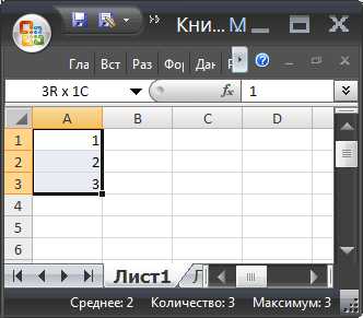 Количество выделенных столбцов и строк отображается в поле Имя (слева от Строки формул) в формате 3Rx1C, что означает, что выделено 3 ячейки в одном столбце.