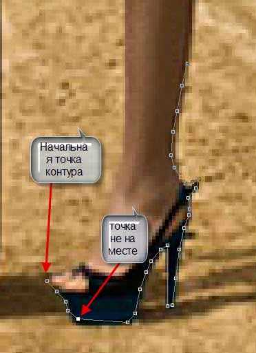 Начнём с туфли на правой ноге. На рисунке я показал прорисовку контура. Но у меня дрогнула рука, или просто не заметил, и одну точку я поставил неправильно.