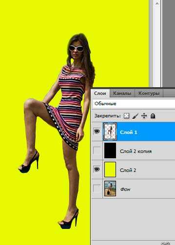 Для того, чтобы были видны все дефекты вырезки, а они будут обязательно, создаём под слоем с вырезанной девушкой два слоя, один чёрный, а другой ядовито-жёлто-зелёный.