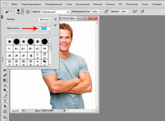 - в настройках инструмента «Кисть» выбирайте не слишком большие цифровые значение жёсткости, чтобы края вырезаемого объекта были чуть сглаженными. Это поможет вам, в дальнейшем, когда вы будете вставлять человека в другое изображение. Таким образом вы избежите очень чётких границ, которые могут выдавать ваш «монтаж»;