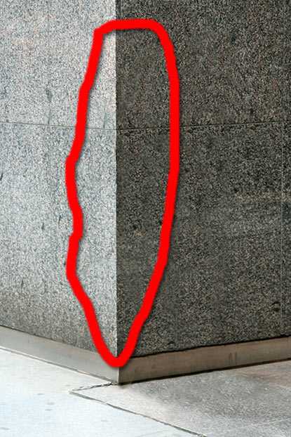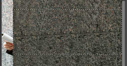 Но у нас остался ещё один недочёт — это горизонтальная полоса на стене, которую мы стёрли. Помните, реалистичность фотомонтажа достигается соблюдением мелочей! Эту полосу придётся восстановить вручную штампом. Увеличиваем масштаб отображения этого участка фотографии и создаём прямоугольное выделение до угла стены: