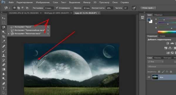Лассо имеет три модификации: простое, прямолинейное и магнитное. Различаются они по степени выделения. Магнитное лассо при выделении прилипает к контурам выделяемого объекта. Оно очень удобно, но контуры должны быть четкими, иначе линия лассо может перейти на другой контур.