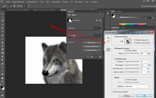 Если передвигать ползунок «Растушевка», то увидим, как изменяются края рисунка. Можно отредактировать края с помощью просто растушевки, а можно сделать несколько точнее, нажав на кнопку «Уточнить-край маски». Откроется окно, в котором изменяя параметры можно получить размытость края рисунка, что бы он не был сильно резким.