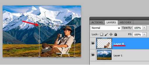 На палитре слоев выделяем мышкой слой, на котором размещена фотография гор, в примере это «Layer 1», и нажимаем комбинацию «Ctrl+T». Появится рамка с маркерами вокруг изображения. Для уменьшения размера фото, потяните мышкой за любой маркер. Чтобы не нарушить пропорции, нажмите и удерживайте при этом клавишу «Shift».