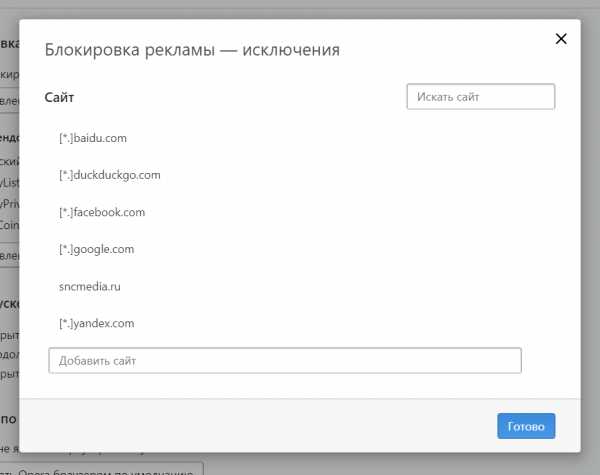 Напротив этой надписи есть кнопка Исключения, нажав на которую, можно пополнить список безопасных сайтов, для которых разрешено открытие всплывающих окон: