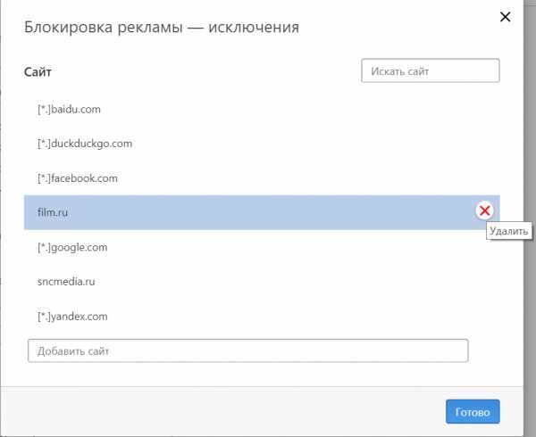 На заметку! Если по какой-либо причине реклама вам необходима, тогда внесите в процесс некоторые изменения. Заблокированный контент появится на веб-сайте, если убрать его из списка исключений. Выделите адрес и нажмите «Удалить». Так реклама заработает снова.