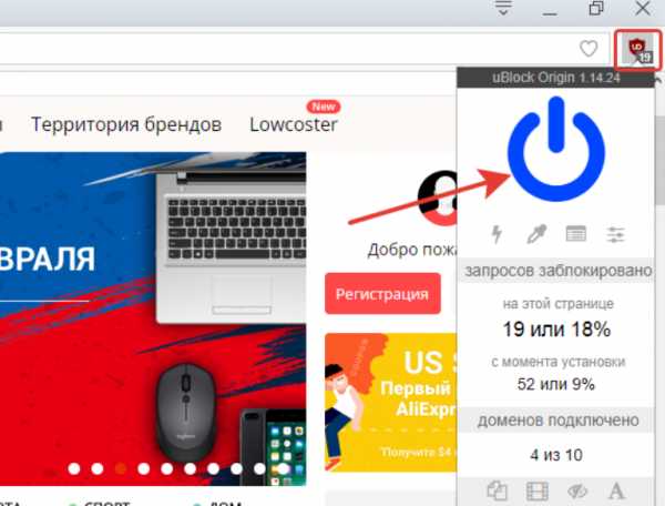 - Запустив веб-страницу мы видим значок блокировщика в правом верхнем углу. С помощью щелчка левой кнопкой мыши на значок блокировщика в открывшемся меню запускаем его переместив переключатель.