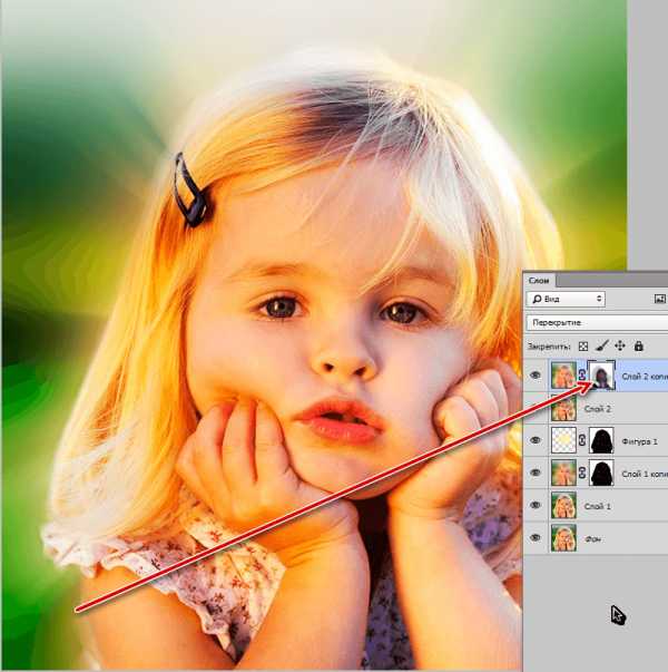 - Переходим на маску верхнего слоя и закрашиваем эффект черной кистью на участках, не относящихся к фону.