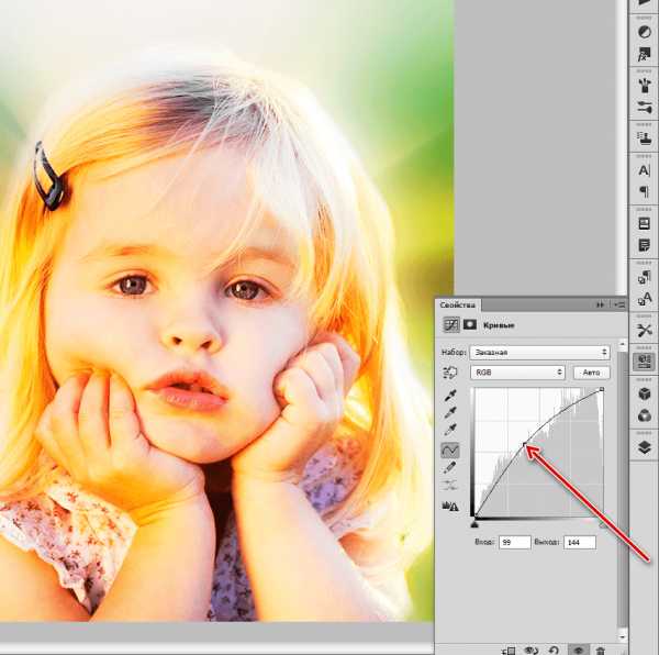 Еще немного улучшим композицию, осветлив лицо ребенка. Создаем корректирующий слой «Кривые».