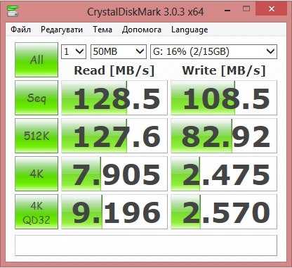 Тест проводится в программе Cristal Disk Mark 3.0.2 x64. Режим — 5 повторений, размер файла 50МБ (наиболее близко к реальному размеру файлов в фотокамере).