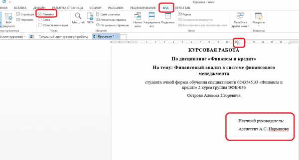 Если в файле Word отсутствует линейка, то «вызвать» ее можно с помощью следующих действий: в меню выберите «Вид» → «Линейка» и поставьте галочку.