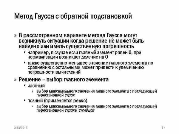 Недостатком метода является накапливание погрешностей в процессе округления, поэтому метод Гаусса без выбора главных элементов используется обычно для решения сравнительно небольших (n100) систем уравнений с плотно заполненной матрицей и не близким к нулю определителем. Если матрица А сильно разрежена, а ее определитель не близок к нулю, то метод Гаусса не пригоден для решения больших систем уравнений.