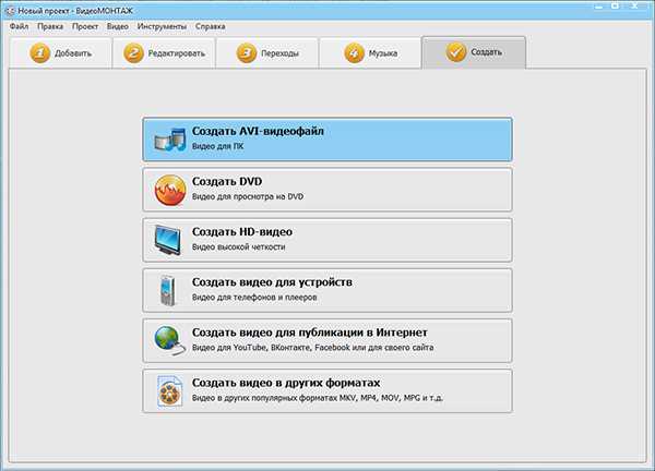 Итак, у вас получилось отличное видео – правда несложно? Осталось сохранить свои труды. На данном этапе нужно выбрать формат видео. Не обязательно разбираться во всех этих AVI и MP4, можно сразу выбрать из списка конечную точку назначения. Нужно видео для записи на DVD или для проигрывания на планшете и смартфоне? А может, нужно выложить его в интернет для просмотра онлайн? Выбор за вами.