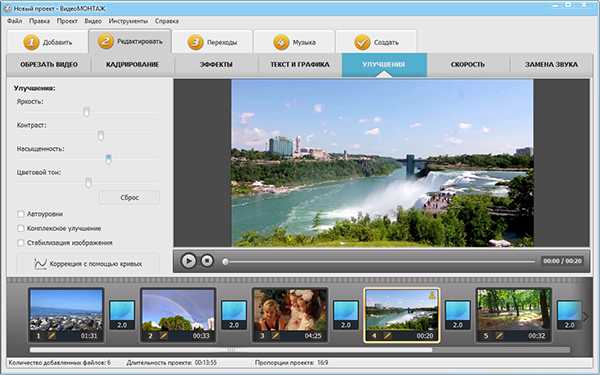 В «ВидеоМОНТАЖе» вас ждет огромный инструментарий. С такими возможностями вам не потребуется редактировать видео онлайн и тратить на это трафик и нервы. Если фильм большой и вы не успеваете смонтировать все за один присест, то сохраните его в форме проекта на ПК и продолжите работу позже. На онлайн-площадках так сделать нельзя. Исходные материалы не блещут качеством? На втором шаге загляните во вкладку «Улучшения». Здесь активируйте автокоррекцию. В таком случае приложение самостоятельно усовершенствует визуальный ряд, вам останется лишь оценить изменения в плеере.