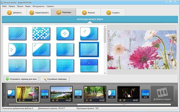 Также уделите особое внимание подбору переходов. Эта анимация сделает ваш фильм еще эффектнее и динамичнее. Выберите для каждого стыка между фрагментами свои переходы или же установите одинаковый стиль для всех. Также в софте предусмотрена функция случайного подбора анимации.