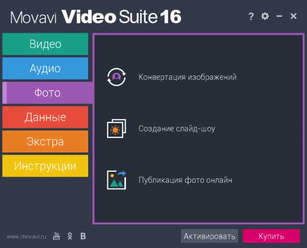 В начальном меню Movavi Video Suite 16 выберите нужный раздел, в зависимости от того, что вы хотите делать в данный момент времени: «Видео», «Аудио», «Фото», «Данные», Экстра», «Инструкции».