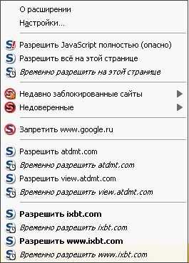 Давайте вернемся к списку NoScript, который отображается при нажатии на левую или правую кнопку мыши на иконке.