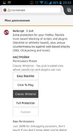 Я знал, что Firefox для Android поддерживает некоторые расширения (NoScript среди них на addons.mozilla.org для Android нету), ставил, смотрел, но ради одного лишь AdBlock переходить не хотелось: на десктопе я всегда работаю с белым списком хостингов скриптов (ScriptSafe, а ранее — NotScripts для Chrome и NoScript для Firefox). Но сегодня я решил основательно погуглить и наткнулся на эту страницу: https://noscript.net/nsa/. Это действительно тот же NoScript с тем же функционалом, что и на десктопе. Больше никаких «удлини свою батарею на 5 см»!