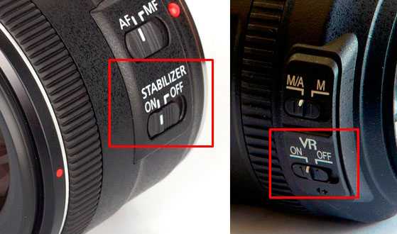 - Стабилизация. Без шумоподавления практически не обойтись, и не всегда такая функция имеется внутри самого фотоаппарата, часто она на объективе. Поэтому если уж и выбирать оптику, то отдавать приоритет только с возможностью стабилизации, которая скомпенсирует на фото мелкое дрожание камеры. При выборе оптики обращайте внимание на его описание: значок для Nikon — VR (Vibration Reduction) и для Canon – IS (Image Stabilization). Кнопка удобно расположена сбоку на объективе. Предполагается, что ее отключают при использовании штатива.