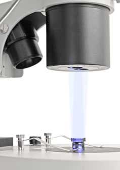 Один из наиболее распространенных видов осветителей. Блок питания встроен в основание стола, сам осветитель удобно расположен под держателем микроскопа, в результате чего он не занимает отдельного места и не мешает пользователю в рабочей зоне. Источником света может быть как галогенная лампа, так и светодиод. Осветитель, за счет создаваемой тени, делает контрастными неровности исследуемого предмета. Подойдет для анализа рельефа и контуров объекта.