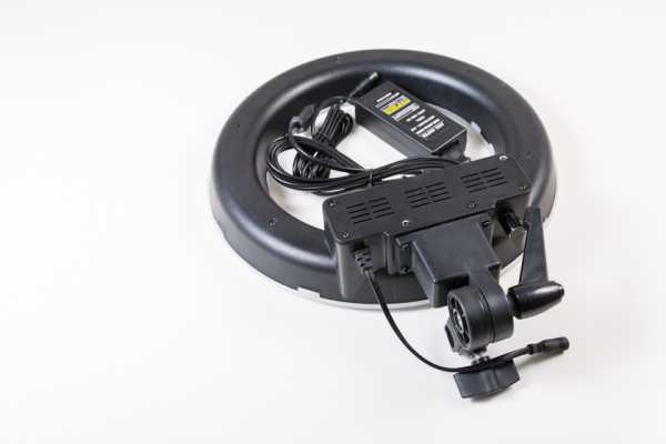 Конструкция кольцевого осветителя FST традиционна и понятна. Но, как приятный бонус, есть ручка для включения/выключения света и для регулировки его интенсивности.