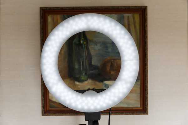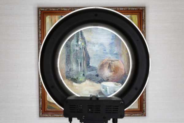 Например, нам понадобилось сделать снимок картины на стене. Ставим кольцевой осветитель, а снимать будем через его центральное отверстие — «дырку в бублике».