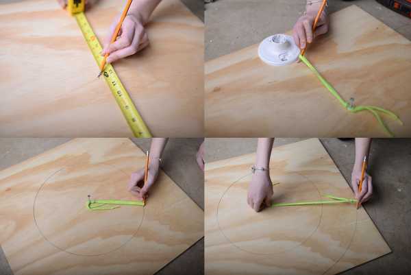 На фанере найдите и отметьте центр, отмерьте нужного вам размера круг. Верёвку закрепите в центре, как на картинке. Затем приложите к краю нарисованного круга ламповый патрон и отметьте его внутренний край.
